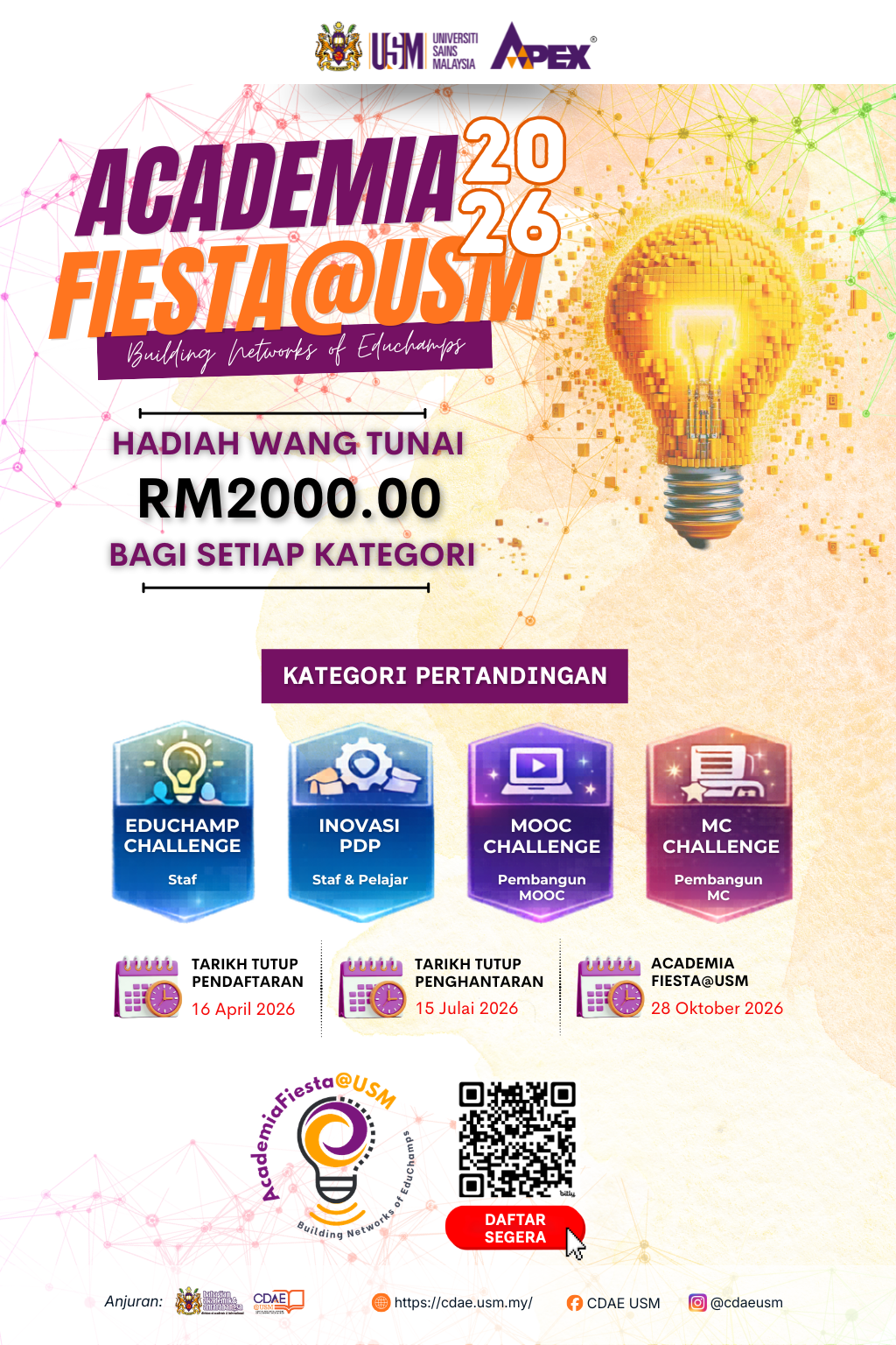 Academia Fiesta@USM dengan tema "Building Networks of EduChamps" bertujuan mendorong dan menggalakkan staf dan pelajar USM untuk menghasilkan idea-idea kreatif dalam mereka bentuk pengajaran dan pembangunan bahan pengajaran dan pembelajaran (PdP).